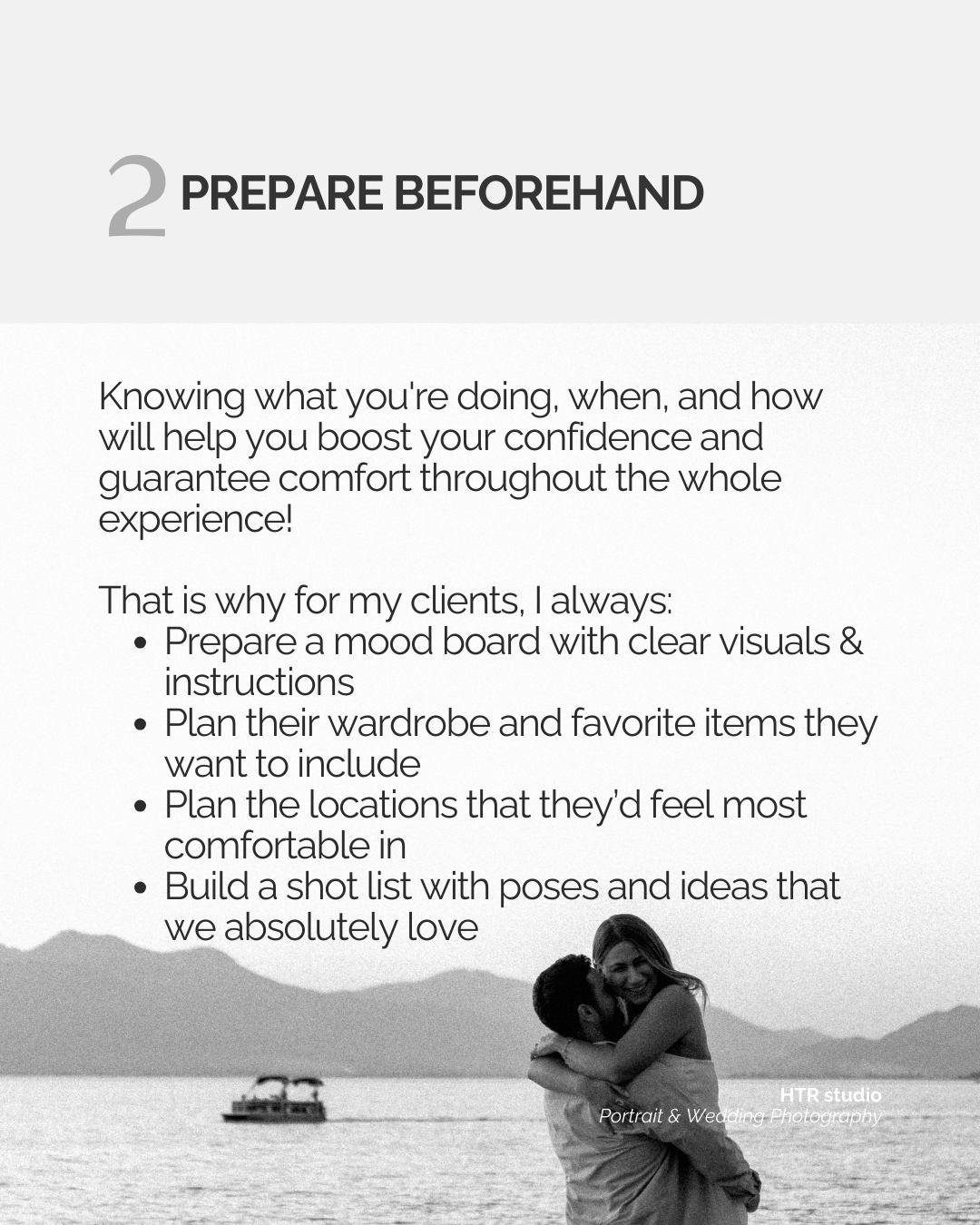 For example, what worked for me and my clients is that after booking and before our photo shoot, we (e-)meet and once again go over the details of the photoshoot. From the ideas, I make a mood board that visually represents our main goal and the aesthetic we’re going for. Then, I plan out an entire schedule & shot list for the photoshoot - as a guide for the day.